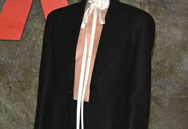 Câștigătoarea premiului Oscar a ales un outfit semnat Dior, compus dintr-un sacou negru elegant, purtat fără cămașă sau sutien, completat de un guler alb plisat, care a oferit întregului look o notă dramatică.