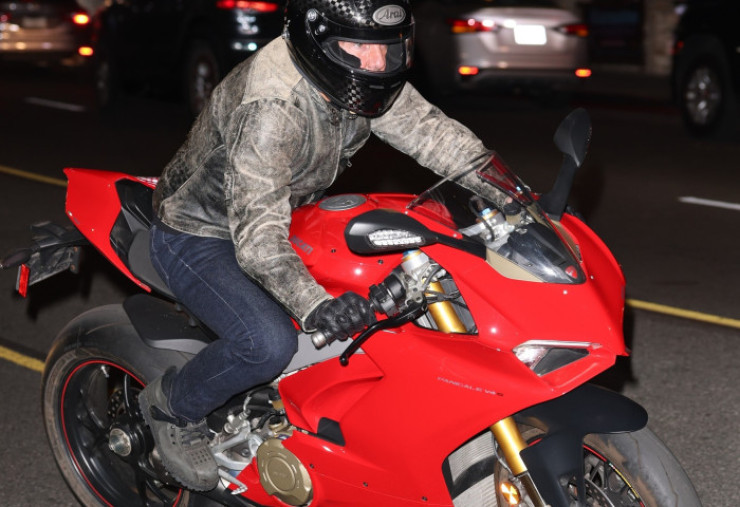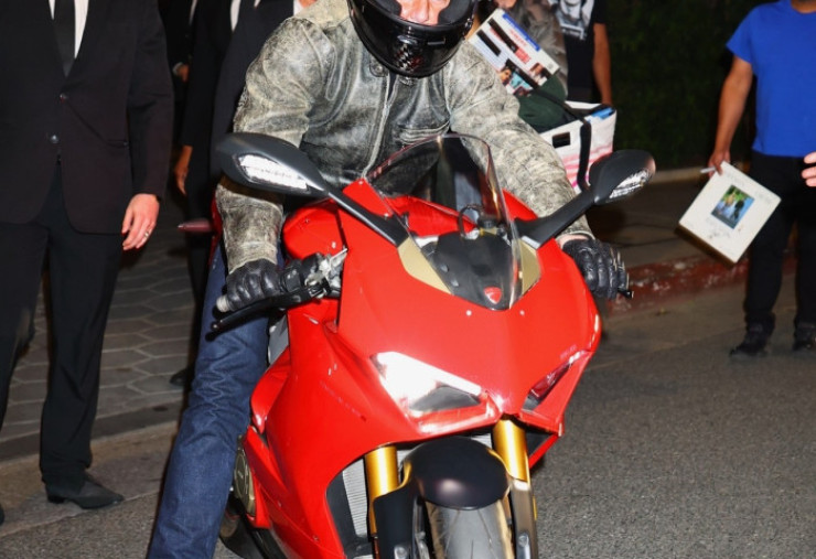 Cu o cască neagră pe cap și o jachetă de piele de care Maverick ar fi mândru, actorul faimos pentru realizarea unora dintre cele mai spectaculoase cascadori și-a salutat fanii înainte de a intra în hotel.